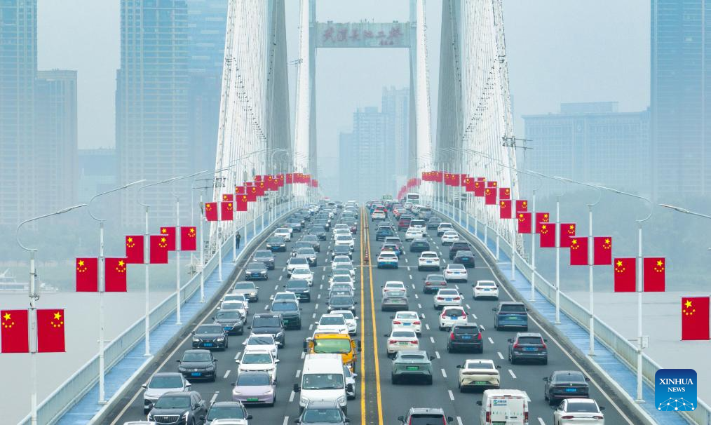 WUHAN, 25 abril, 2026 (Xinhua) -- Imagen tomada con un dron el 1 de octubre de 2025 de vehículos circulando a través del segundo puente sobre el río Yangtse, en Wuhan, en la provincia de Hubei, en el centro de China. Actualmente, cerca de 50 puentes han sido terminados o están en construcción a lo largo del tramo de Hubei del río Yangtse. Los servicios de ferry eran el único medio de transporte para cruzar el río antes de octubre de 1957 cuando se puso en funcionamiento el puente carretero y ferroviario de Wuhan, el primero de su tipo en el río Yangtse. Ahora, lo que antes era un cruce de río que consumía mucho tiempo, se puede completar en tan solo diez minutos, lo que facilita los desplazamientos diarios de las personas y allana el camino para un desarrollo regional coordinado. (Xinhua/Xiao Yijiu)