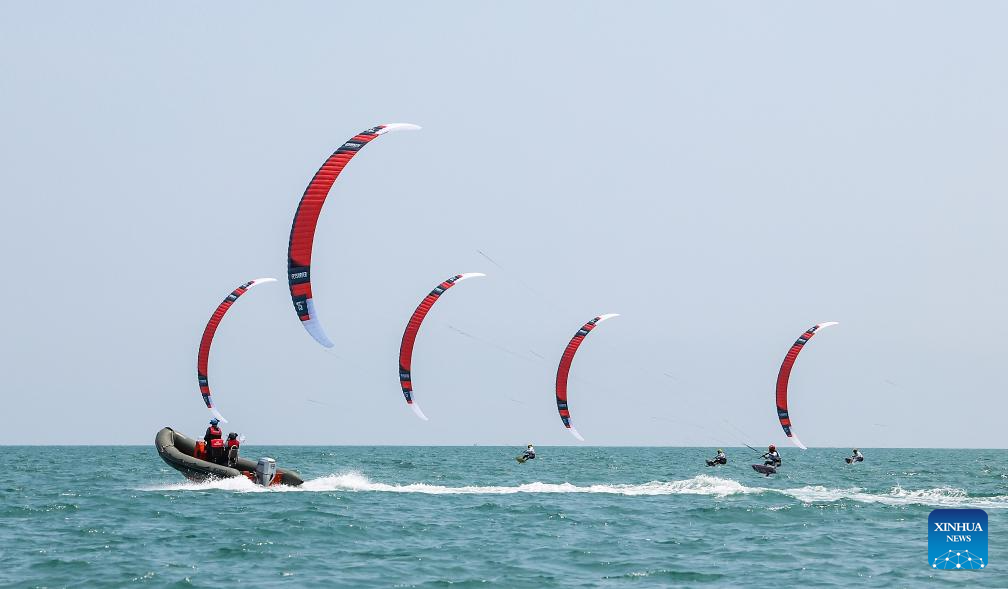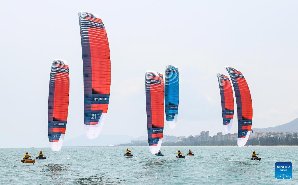 SANYA, 25 abril, 2026 (Xinhua) -- Atletas compiten durante la carrera de formula kite masculina de vela en los VI Juegos Asiáticos de Playa, en Sanya, en la provincia de Hainan, en el sur de China, el 25 de abril de 2026. (Xinhua/Zhang Fan)