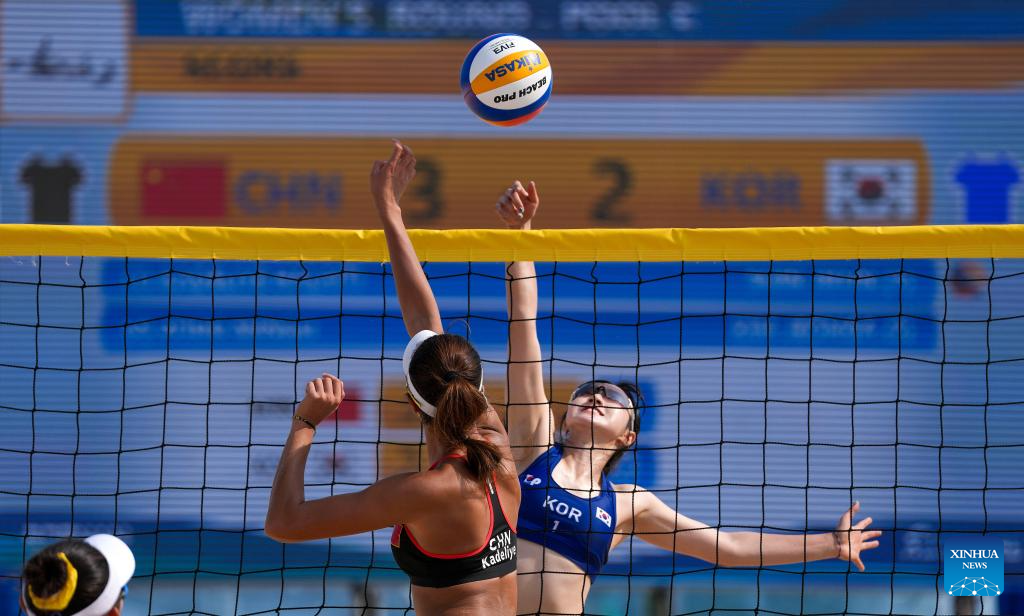 SANYA, 25 abril, 2026 (Xinhua) -- Shin Jieun (d), de República de Corea, compite durante el partido preliminar del grupo C de voleibol de playa femenino entre Kadeliye Halaiti/Zhou Mingli, de China, y Shin Jieun/Kim Jeonga, de República de Corea, en los VI Juegos Asiáticos de Playa, en Sanya, en la provincia de Hainan, en el sur de China, el 25 de abril de 2026. (Xinhua/Jigme Dorje)