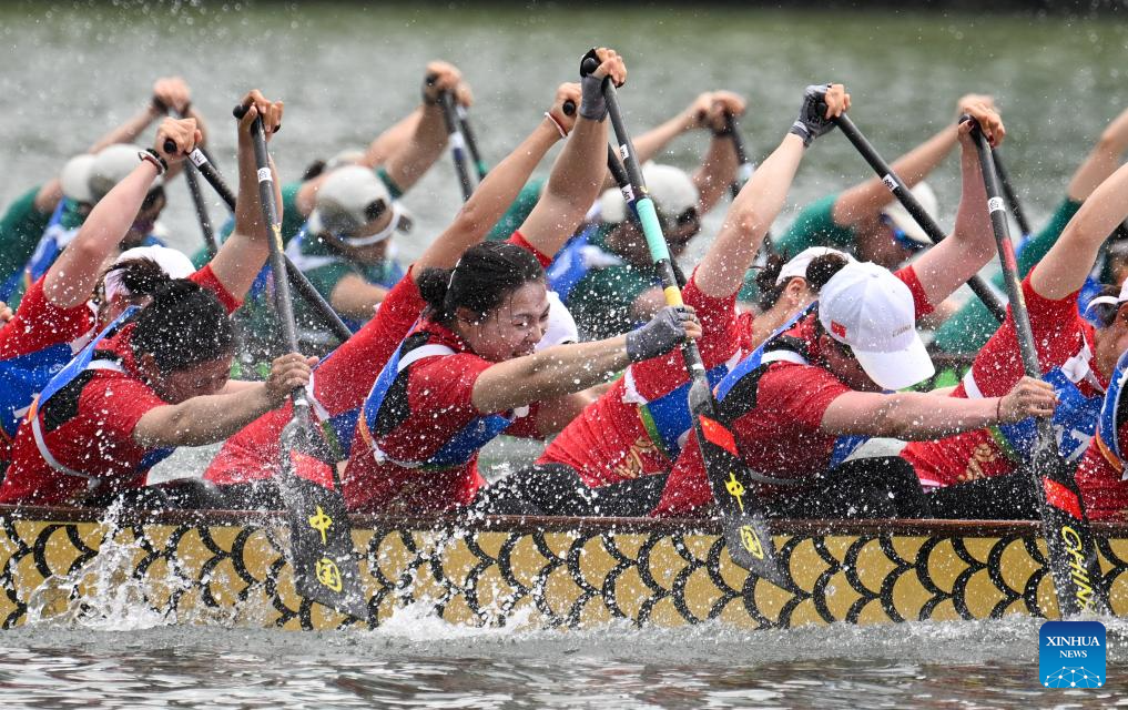 SANYA, 25 abril, 2026 (Xinhua) -- El equipo de China compite durante la final de la carrera de 200 m en línea recta femenina para botes pequeños del evento de botes del dragón en los VI Juegos Asiáticos de Playa, en Sanya, en la provincia de Hainan, en el sur de China, el 25 de abril de 2026. (Xinhua/Yang Guanyu)
