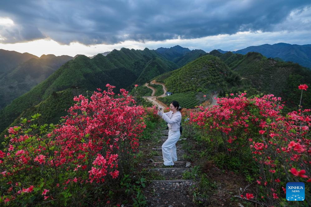 HANGZHOU, 26 abril, 2026 (Xinhua) -- Imagen del 24 de abril de 2026 de una turista tomando fotografías de azaleas alpinas en flor, en la aldea de Jinling del municipio de Pingmen en el distrito de Chun'an, en la provincia de Zhejiang, en el este de China. Ubicada a más de 1.000 metros sobre el nivel del mar, la aldea de Jinling es una de las más altas del distrito de Chun'an. (Xinhua/Xu Yu)