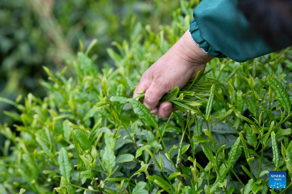 HUANGSHAN, 27 abril, 2026 (Xinhua) -- Imagen del 25 de abril de 2026 de un agricultor de té revisando las hojas de té, en la aldea de Houkeng, en el distrito de Huangshan de la ciudad de Huangshan, en la provincia de Anhui, en el este de China. El Taiping Houkui es un famoso té verde de Anhui, conocido por sus hojas planas y alargadas. Ofrece un aroma único, un sabor suave y un regusto dulce. (Xinhua/Zhang Duan)