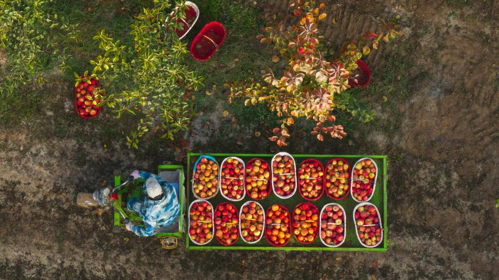 Trabajadores transportan manzanas recién recolectadas en la ciudad de Alaer, Xinjiang