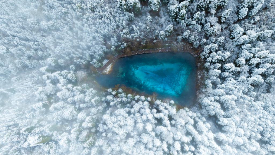 Paisaje del punto escénico de Jiuzhaigou después de la nevada en provincia de Sichuan