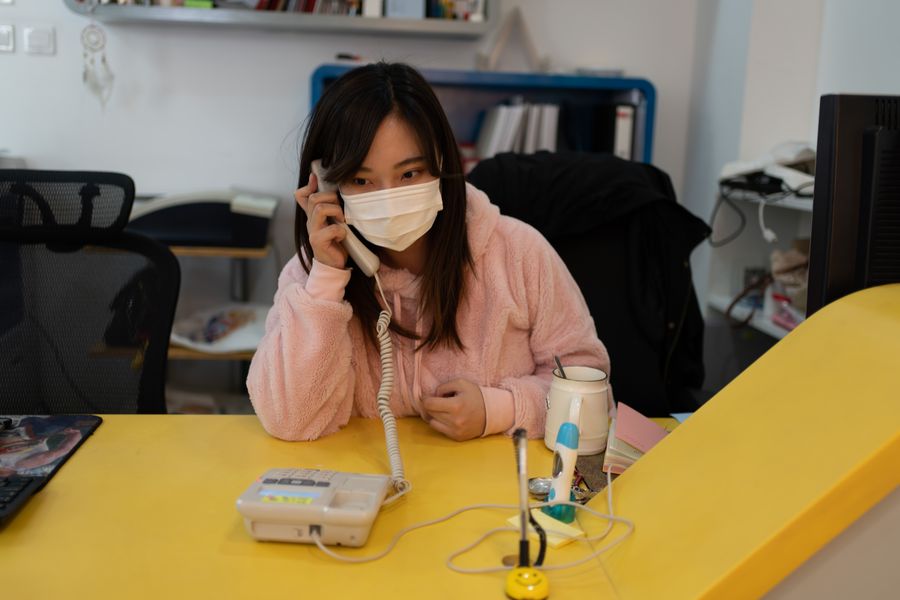 Asistente de la biblioteca contesta una llamada de consulta. (Xinhua/Xu Yongzheng)