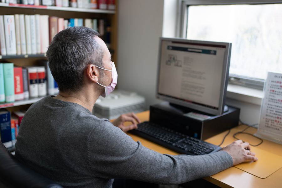 Alberto Sánchez, coordinador académico de la biblioteca, trabaja en el ordenador. (Xinhua/Xu Yongzheng)