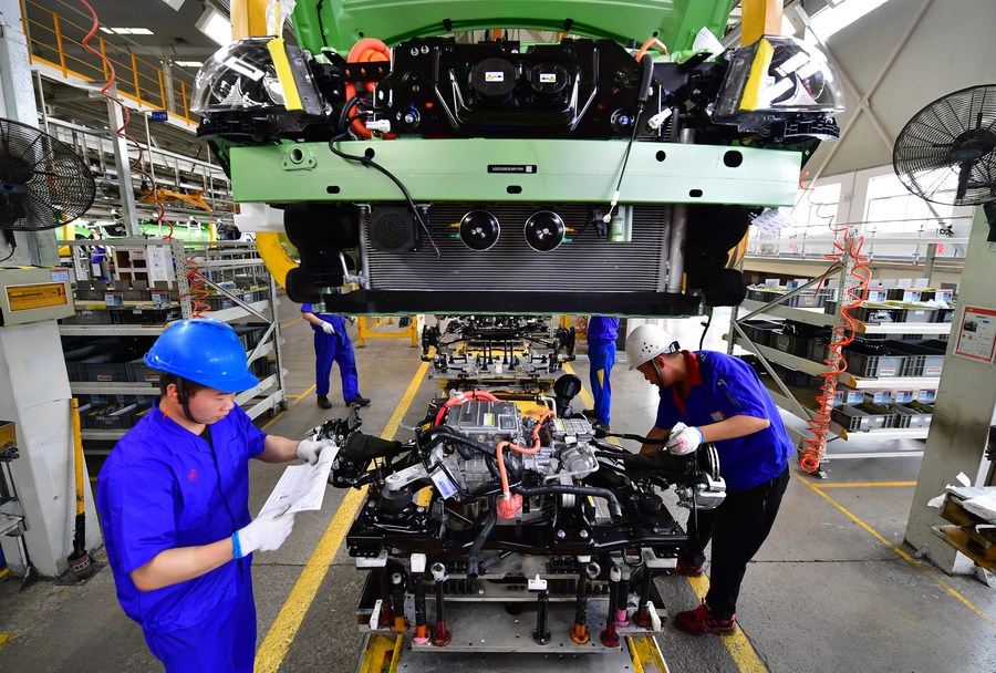 Imagen del 12 de junio de 2019 de trabajadores instalando un motor eléctrico a un vehículo de nueva energía en la planta de Xi'an de BYD Auto, en Xi'an, provincia de Shaanxi, en el noroeste de China. (Xinhua/Shao Rui)