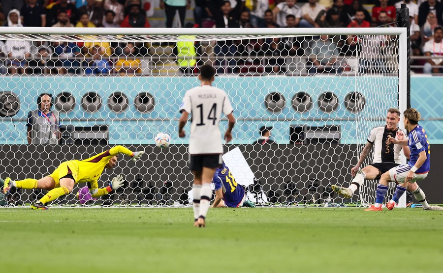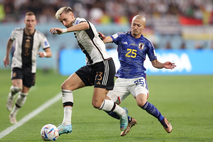 Doan Ritsu (d), de Japón anota durante el partido del Grupo E entre Alemania y Japón en la Copa Mundial de la FIFA 2022 en el Estadio Internacional Khalifa, en Doha, Qatar, el 23 de noviembre de 2022. (Xinhua/Lan Hongguang)