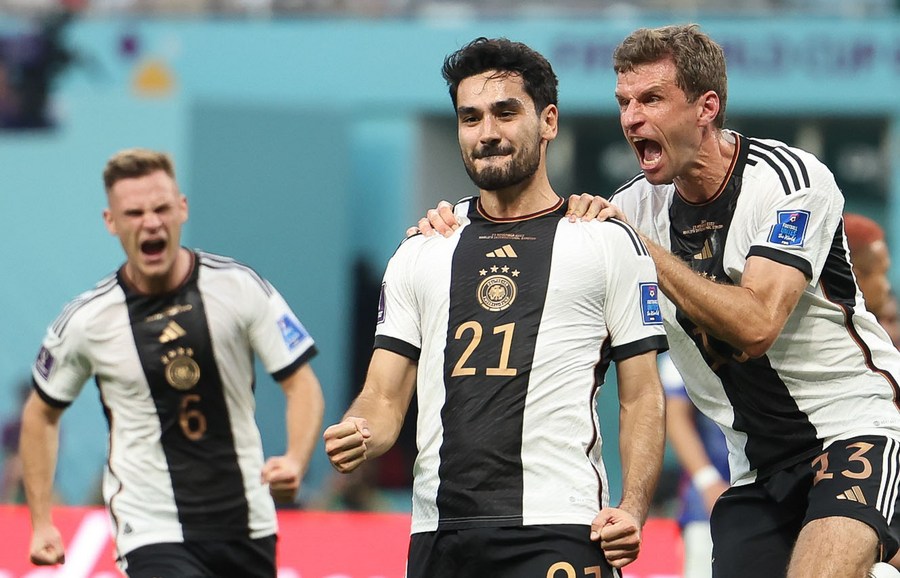 Ilkay Guendogan (c), de Alemania, festeja con su compañero Thomas Mueller (d) después de anotar a través de tiro penal durante el partido del Grupo E entre Alemania y Japón en la Copa Mundial de la FIFA 2022 en el Estadio Internacional Khalifa, en Doha, Qatar, el 23 de noviembre de 2022. (Xinhua/Pan Yulong)