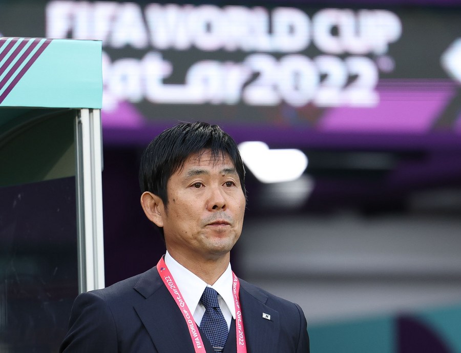 Hajime Moriyasu, director técnico de Japón, reacciona previo al partido del Grupo E entre Alemania y Japón en la Copa Mundial de la FIFA 2022 en el Estadio Internacional Khalifa, en Doha, Qatar, el 23 de noviembre de 2022. (Xinhua/Pan Yulong)
