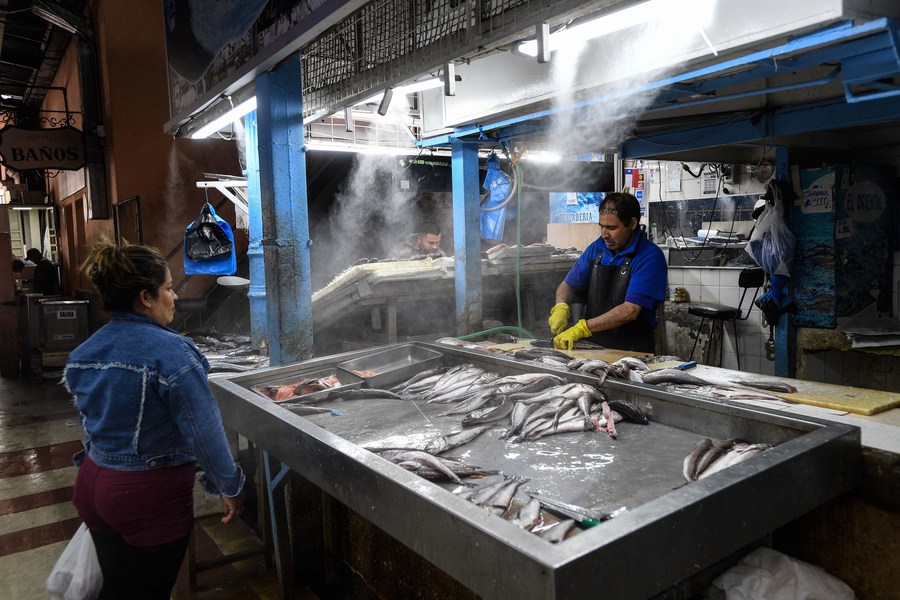 Un vendedor atiende a una clienta en el Mercado Central de Santiago, en Santiago, capital de Chile, el 12 de octubre de 2022. (Xinhua/Jorge Villegas)