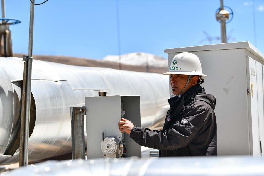 Un técnico verifica la operación del equipo en la central geotérmica Yangyi en el distrito de Damxung de Lhasa, en la suroccidental región autónoma china del Tíbet, el 6 de abril de 2023. (Xinhua/Jigme Dorje)