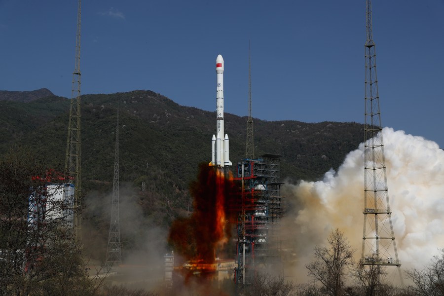 Un cohete portador Gran Marcha-3B que transporta el Gaofen-13 02, un nuevo satélite de observación de la Tierra, despega desde el Centro de Lanzamiento de Satélites de Xichang, en la provincia suroccidental china de Sichuan, el 17 de marzo de 2023. (Xinhua/Ying Longfei)