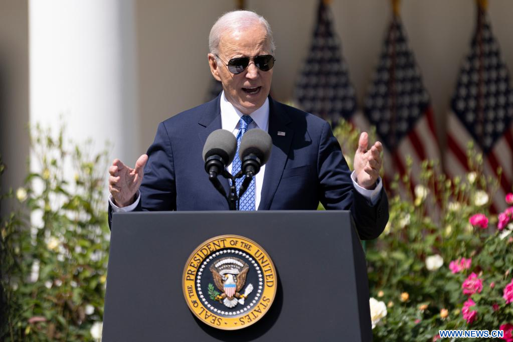 WASHINGTON, 25 abril, 2023 (Xinhua) -- Imagen del 24 de abril de 2023 del presidente estadounidense, Joe Biden, pronunciando un discurso durante un evento en la Casa Blanca, en Washington, D.C., Estados Unidos. Biden anunció formalmente el martes que se postulará para la reelección presidencial en 2024, buscando otros cuatro años en la Casa Blanca, según un video de campaña en línea. (Xinhua/Aaron Schwartz)