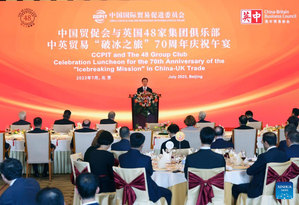 Han hizo estas declaraciones al asistir a un evento conmemorativo del 70º aniversario de la "Misión para romper el hielo" en el comercio sino-británico, donde leyó una carta de felicitación enviada por el presidente chino, Xi Jinping.