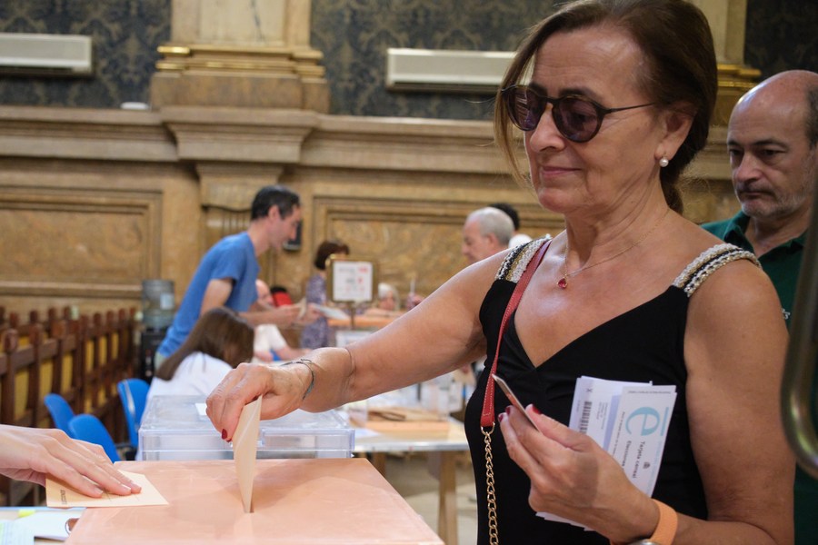 Una mujer emite su voto en un colegio electoral, en Madrid, España, el 23 de julio de 2023. (Xinhua/Meng Dingbo)