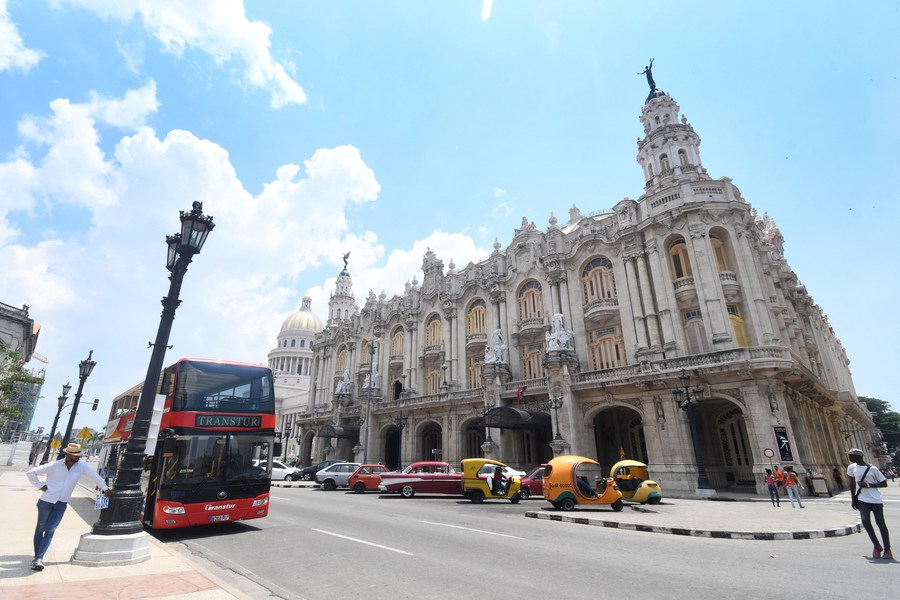 Personas caminan frente al gran Teatro de La Habana, en La Habana, capital de Cuba, el 16 de julio de 2022. (Xinhua/Joaquín Hernández)