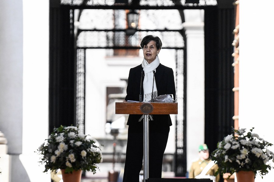 La senadora e hija del expresidente chileno Salvador Allende, Isabel Allende Bussi, pronuncia un discurso durante la ceremonia de conmemoración de los 50 años del golpe de Estado del 11 de septiembre de 1973, en la Plaza de la Constitución, en Santiago, capital de Chile, el 11 de septiembre de 2023. (Xinhua/Jorge Villegas)