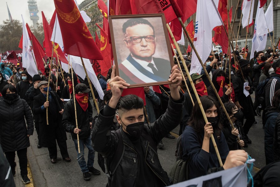 Un joven sostiene un retrato del fallecido expresidente chileno Salvador Allende, mientras participa en una marcha en el marco de la conmemoración del 48º aniversario del golpe de Estado del 11 de septiembre de 1973, en Santiago, capital de Chile, el 11 de septiembre de 2021. (Xinhua/Jorge Villegas)