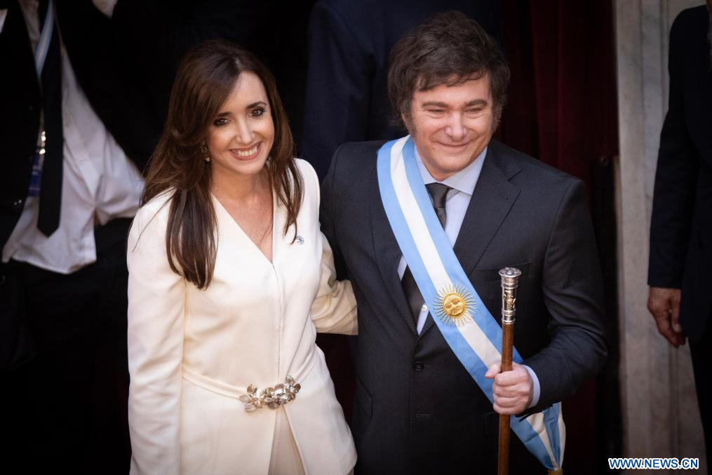 El presidente argentino, Javier Milei (d), reacciona junto a la vicepresidenta, Victoria Villarruel (i), durante la ceremonia de Asunción Presidencial, en el Congreso Nacional, en la ciudad de Buenos Aires, capital de Argentina, el 10 de diciembre de 2023. El nuevo presidente de Argentina, Javier Milei, convocó el domingo a abrir una "nueva era" en el país sudamericano, en su primer discurso como mandatario. (Xinhua/Martín Zabala)