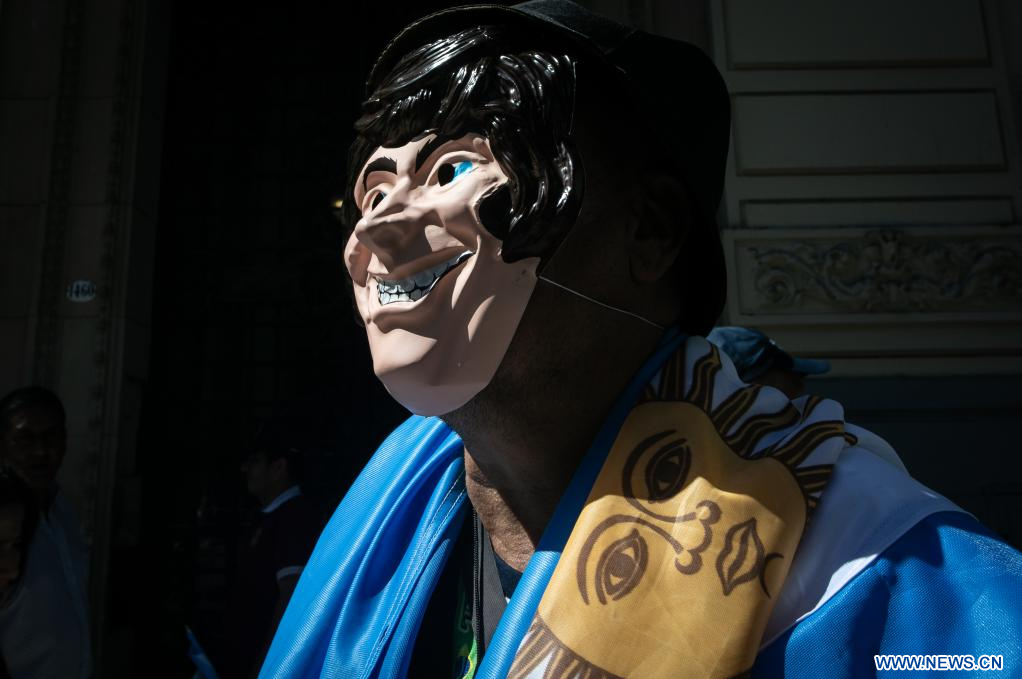 Un hombre porta una máscara del presidente argentino, Javier Milei, en el marco de la ceremonia de Asunción Presidencial de Javier Milei como presidente de Argentina, sobre la Avenida de Mayo, en la ciudad de Buenos Aires, capital de Argentina, el 10 de diciembre de 2023. El nuevo presidente de Argentina, Javier Milei, convocó el domingo a abrir una "nueva era" en el país sudamericano, en su primer discurso como mandatario.(Xinhua/Alberto Raggio)