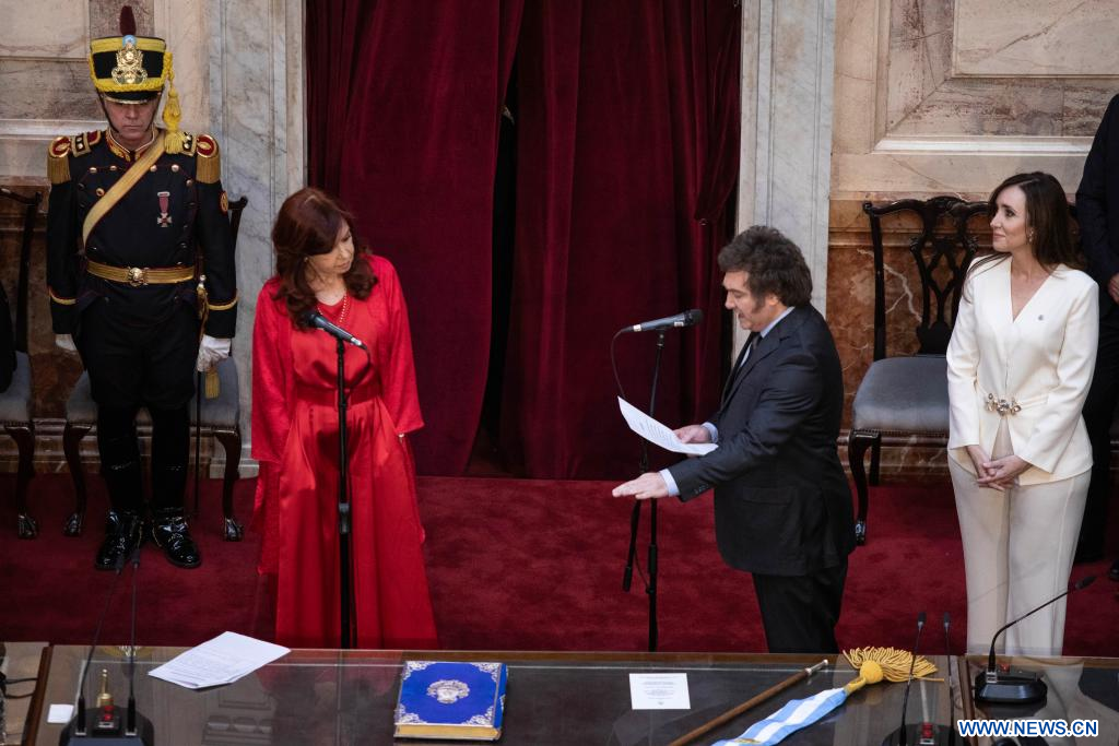 La vicepresidenta saliente, Cristina Fernández (i-frente), toma juramento como presidente de Argentina a Javier Milei (d-frente), ante la mirada de la vicepresidenta entrante, Victoría Villarruel (d), durante la ceremonia de Asunción Presidencial, en el Congreso Nacional, en la ciudad de Buenos Aires, capital de Argentina, el 10 de diciembre de 2023. El nuevo presidente de Argentina, Javier Milei, convocó el domingo a abrir una "nueva era" en el país sudamericano, en su primer discurso como mandatario. (Xinhua/Martín Zabala)