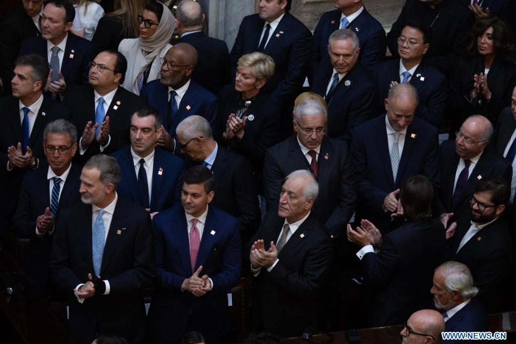 Invitados internacionales entre los que se encuentran líderes y representantes de distintos países reaccionan durante la ceremonia de Asunción Presidencial del presidente de Argentina, Javier Milei, en el Congreso Nacional, en la ciudad de Buenos Aires, Argentina, el 10 de diciembre de 2023. El nuevo presidente de Argentina, Javier Milei, convocó el domingo a abrir una "nueva era" en el país sudamericano, en su primer discurso como mandatario. (Xinhua/Martín Zabala)