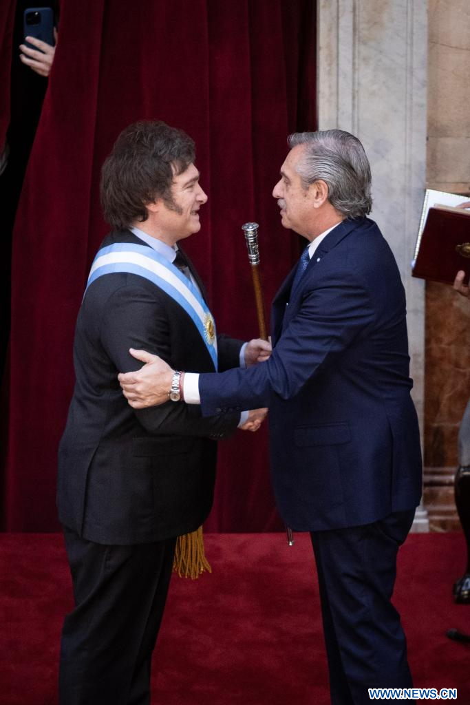 El presidente de Argentina, Javier Milei (i), reacciona junto al ex presidente argentino, Alberto Fernández (d), después de la ceremonia de Asunción Presidencial, en el Congreso Nacional, en la ciudad de Buenos Aires, capital de Argentina, el 10 de diciembre de 2023. El nuevo presidente de Argentina, Javier Milei, convocó el domingo a abrir una "nueva era" en el país sudamericano, en su primer discurso como mandatario. (Xinhua/Martín Zabala)