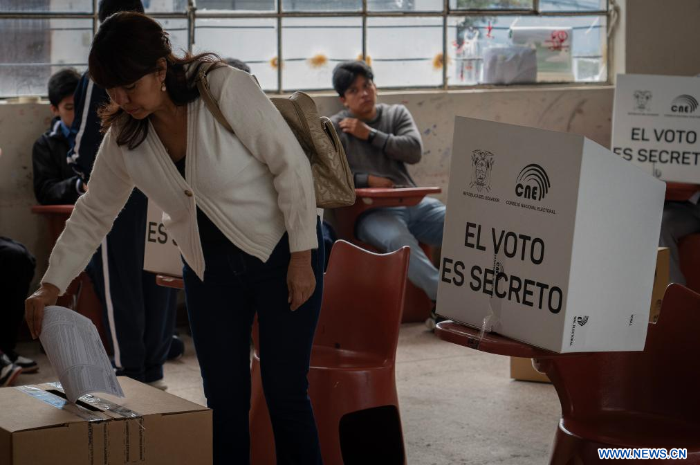 Una mujer deposita su voto en una urna en un colegio electoral, en Quito, capital de Ecuador, el 21 de abril de 2024. Los colegios electorales en Ecuador abrieron el domingo a las 07:00 hora local (12:00 GMT) para las votaciones de la consulta popular y referendo constitucional propuesto por el Gobierno sobre temas de seguridad, justicia, empleo y arbitrajes internacionales. (Xinhua/Str)