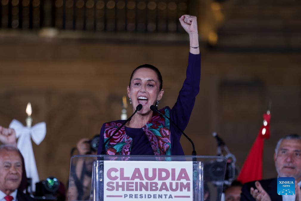 MÉXICO, 3 jun (Xinhua) -- La candidata oficialista a la presidencia de México por la coalición Sigamos Haciendo Historia, Claudia Sheinbaum, celebró la madrugada de hoy lunes su victoria en las urnas después de que el Instituto Nacional Electoral (INE) diera a conocer el resultado del conteo rápido de los votos, en el que aparece a la cabeza con un rango de entre el 58,3 y el 60,7 por ciento.