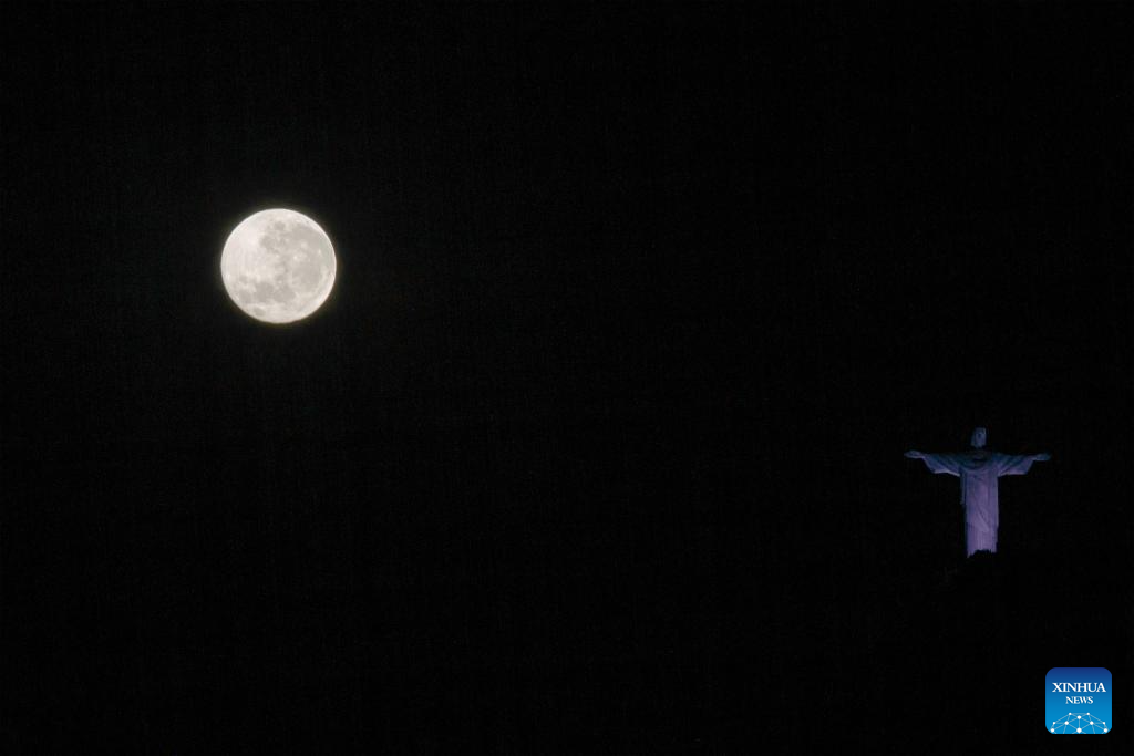 RIO DE JANEIRO, 20 agosto, 2024 (Xinhua) -- La luna llena es vista cerca del monumento del Cristo Redentor, en Río de Janeiro, Brasil, el 20 de agosto de 2024. (Xinhua/Claudia Martini)