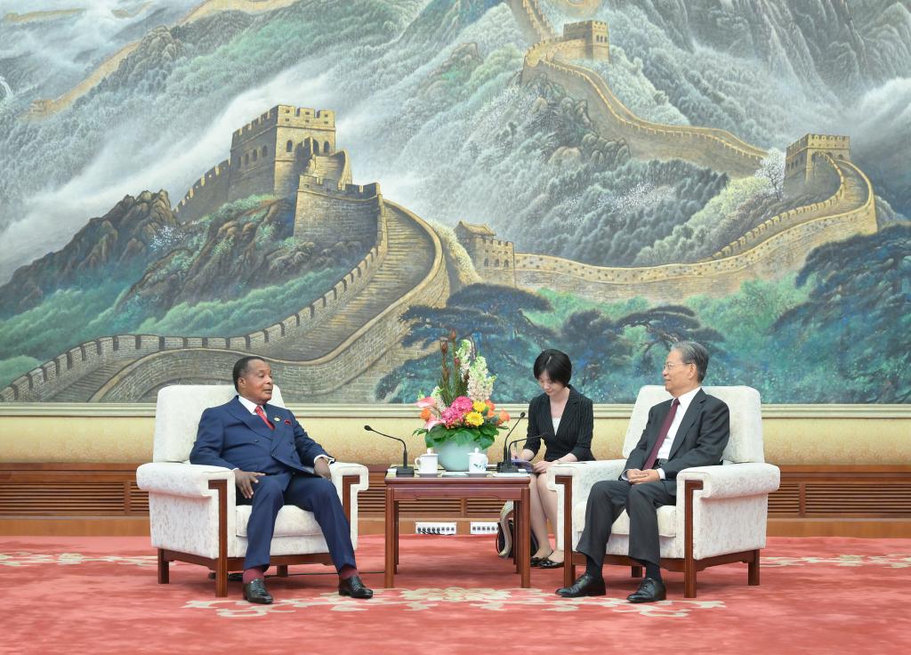 BEIJING, 6 septiembre, 2024 (Xinhua) -- Zhao Leji, presidente del Comité Permanente de la Asamblea Popular Nacional, se reúne con el presidente de la República del Congo, Denis Sassou Nguesso, quien se encuentra en Beijing para asistir a la Cumbre 2024 del Foro de Cooperación China-África (FOCAC, siglas en inglés) y realizar una visita de Estado, en Beijing, capital de China, el 6 de septiembre de 2024. (Xinhua/Gao Jie)