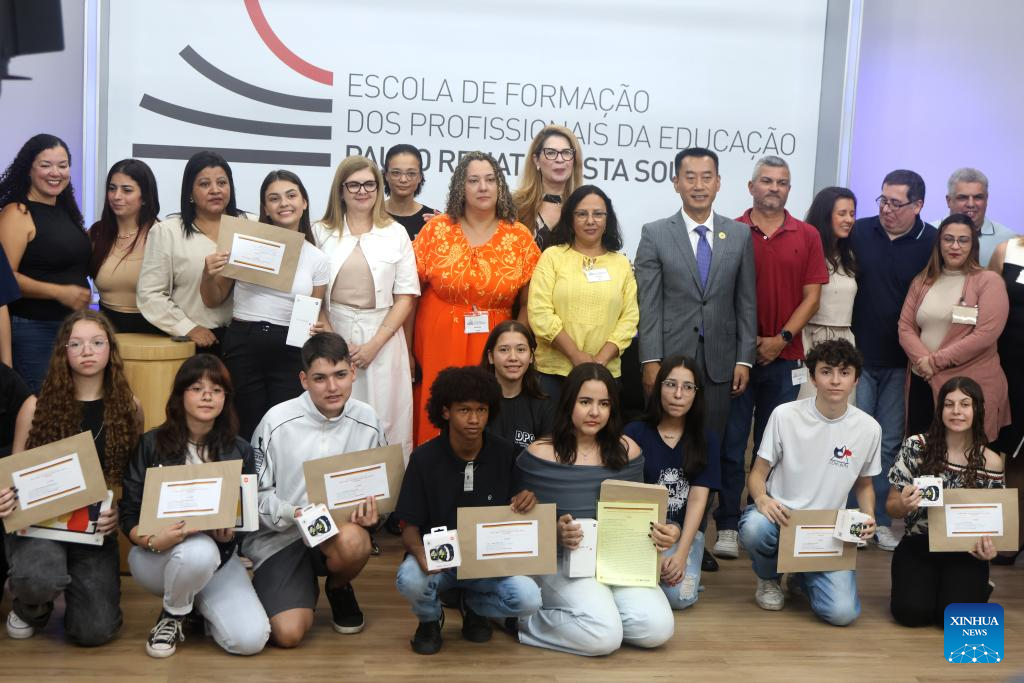 SAO PAULO, 5 diciembre, 2024 (Xinhua) -- El vicecónsul general de China en Sao Paulo, Tian Yuzhen (6-d-atrás), posa para fotografías con los ganadores del Concurso de Ensayo China y Brasil "50 años de amistad más allá de las fronteras", en Sao Paulo, Brasil, el 5 de diciembre de 2024. (Xinhua/Rahel Patrasso)