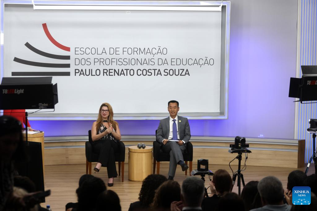 SAO PAULO, 5 diciembre, 2024 (Xinhua) -- El vicecónsul general de China en Sao Paulo, Tian Yuzhen (d), y la asesora de Relaciones Internacionales, Simone Telles (i), asisten al evento del Concurso de Ensayo China y Brasil "50 años de amistad más allá de las fronteras", en Sao Paulo, Brasil, el 5 de diciembre de 2024. (Xinhua/Rahel Patrasso)