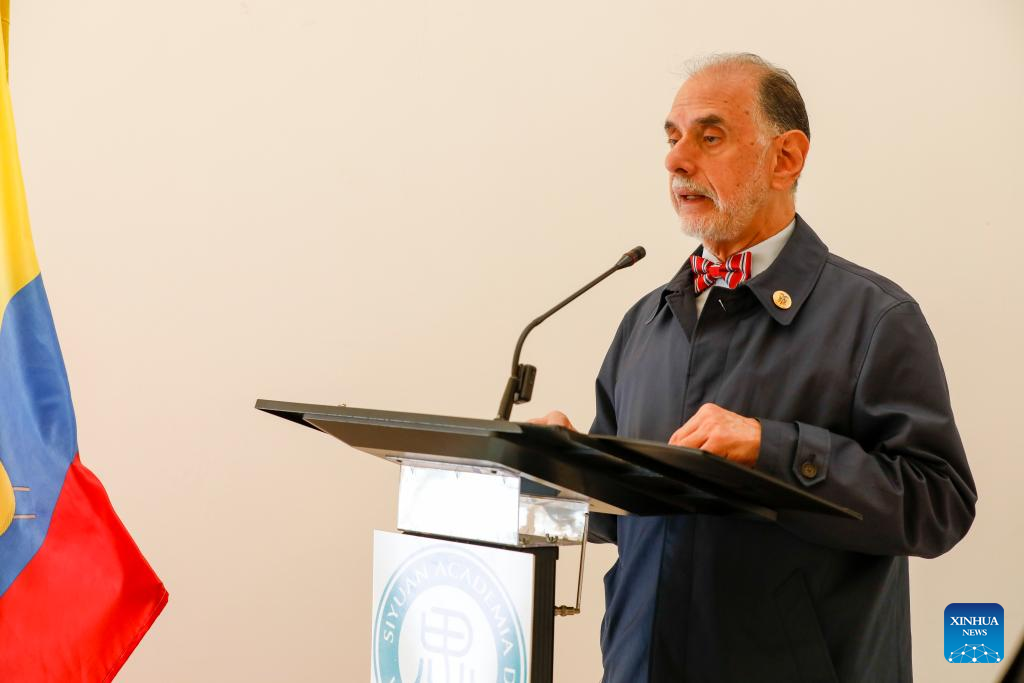 Imagen del 1 de septiembre del 2025 del viceministro de Defensa encargado de Ecuador, Roberto Quintero, pronunciando un discurso en la ceremonia de inauguración del primer curso de enseñanza del idioma chino mandarín en la sede de la Academia de Lengua China Siyuan, en la ciudad de Quito, capital de Ecuador. Autoridades de las Fuerzas Armadas de Ecuador y de la Embajada de China en Quito inauguraron el lunes el primer curso de enseñanza del idioma chino mandarín dirigido a 60 militares locales, en el marco de un programa de cooperación interinstitucional. (Xinhua/Ricardo Landeta)