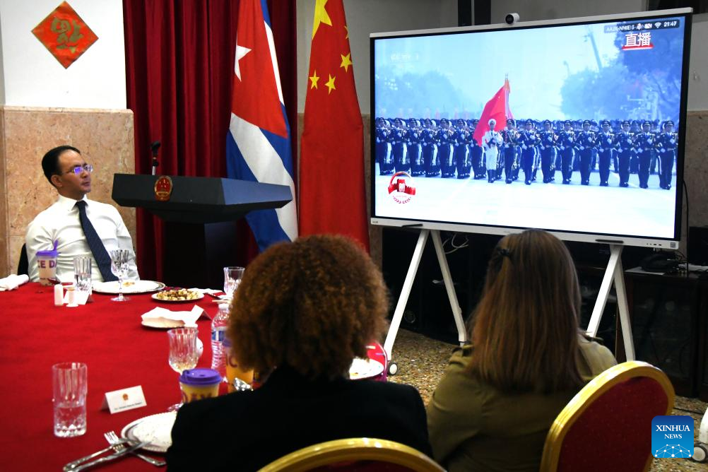 En la sede de la Embajada de China en La Habana, cubanos y chinos se reunieron para apreciar por televisión la parada militar, donde se exhibió un moderno armamento y desfilaron distintos cuerpos del Ejército Popular de Liberación.