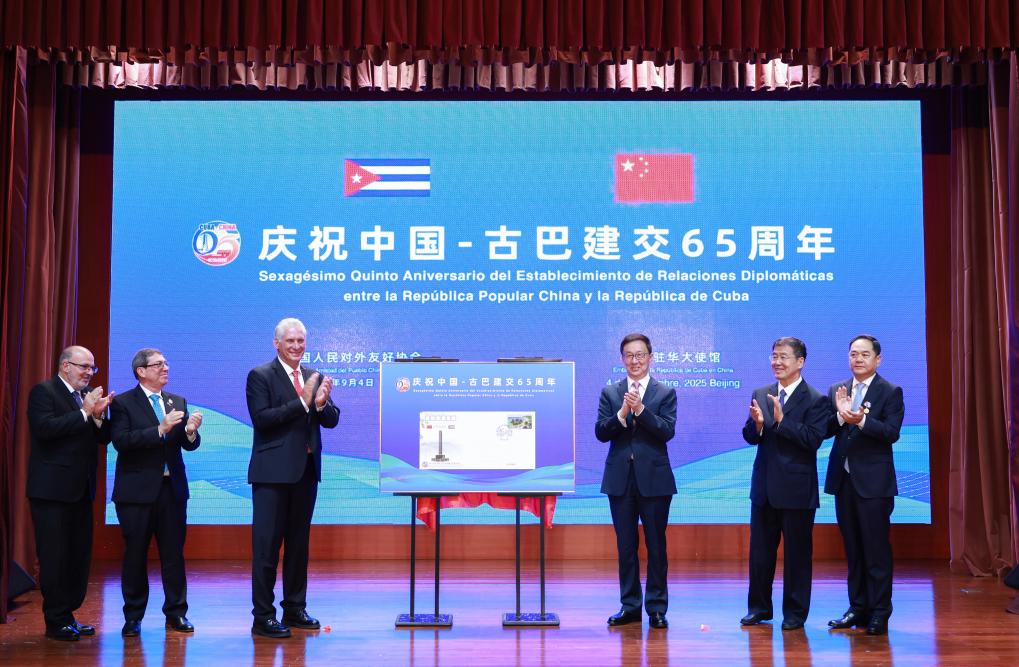 El vicepresidente chino, Han Zheng, y el presidente cubano, Miguel Díaz-Canel, develan el sobre conmemorativo del 65º aniversario del establecimiento de relaciones diplomáticas entre China y Cuba, en Beijing, capital de China, el 4 de septiembre de 2025. Han y Díaz-Canel asistieron el jueves en Beijing a una actividad para celebrar el 65º aniversario del establecimiento de relaciones diplomáticas entre China y Cuba y pronunciaron discursos. (Xinhua/Wang Ye)