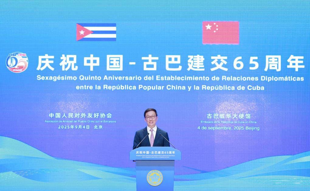 El vicepresidente chino, Han Zheng, pronuncia un discurso mientras asiste a una actividad para celebrar el 65º aniversario del establecimiento de relaciones diplomáticas entre China y Cuba junto con el presidente cubano, Miguel Díaz-Canel, en Beijing, capital de China, el 4 de septiembre de 2025. (Xinhua/Wang Ye)