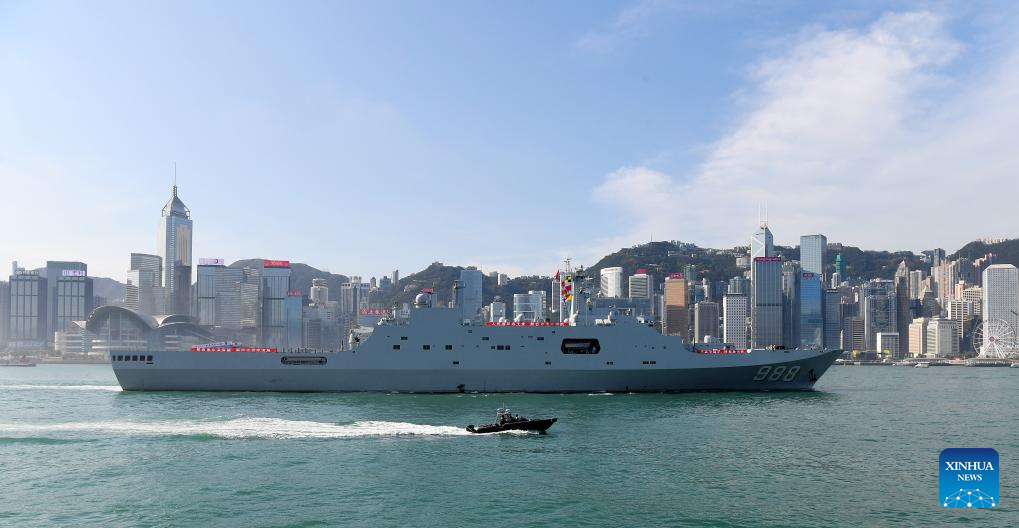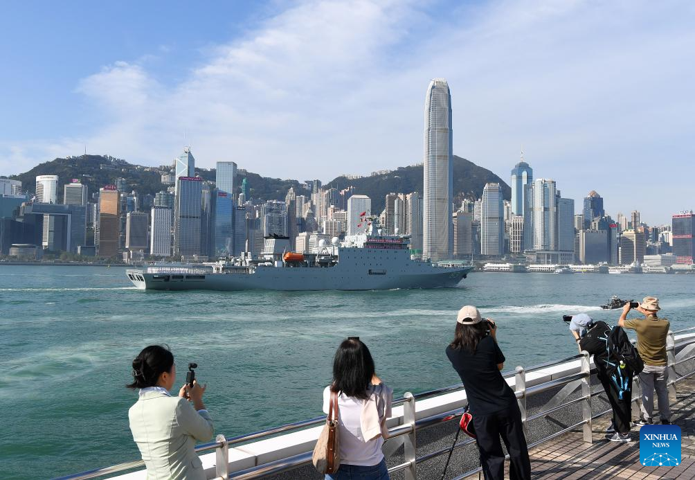 HONG KONG, 30 septiembre, 2025 (Xinhua) -- El buque naval Yimengshan de la Armada del Ejército Popular de Liberación (EPL) de China pasa por el puerto Victoria, en Hong Kong, en el sur de China, el 30 de septiembre de 2025. Los buques navales Qi Jiguang y Yimengshan de la Armada del EPL de China entraron la mañana del martes a las aguas de la Región Administrativa Especial de Hong Kong (RAEHK). Escoltados por buques de la Guarnición del EPL en Hong Kong y del Gobierno de la RAEHK, Qi Jiguang y Yimengshan zarparon rumbo a la base naval de la Guarnición del EPL en Hong Kong en la isla Stonecutters. Los dos buques estarán abiertos al público en la Base Naval de la isla Stonecutters. (Xinhua/Chen Duo)