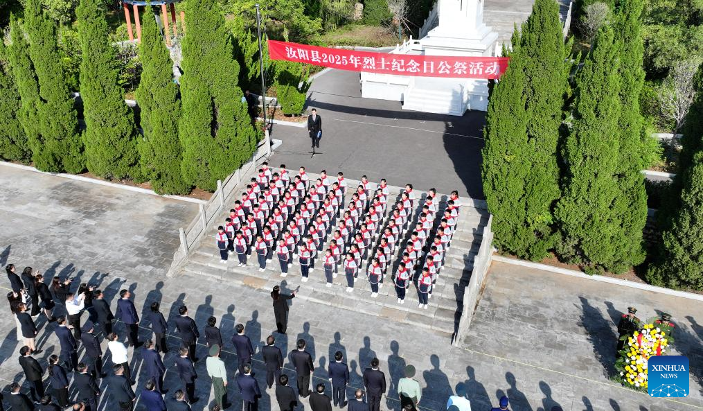 BEIJING, 30 septiembre, 2025 (Xinhua) -- Vista aérea tomada con un dron el 30 de septiembre de 2025 de estudiantes asistiendo a un evento conmemorativo en un cementerio para mártires, en el distrito de Ruyang, en la provincia de Henan, en el centro de China. China celebró el martes su 12 Día de los Mártires con conmemoraciones realizadas en todo el país para honrar a los héroes nacionales caídos. (Xinhua/Kang Hongjun)