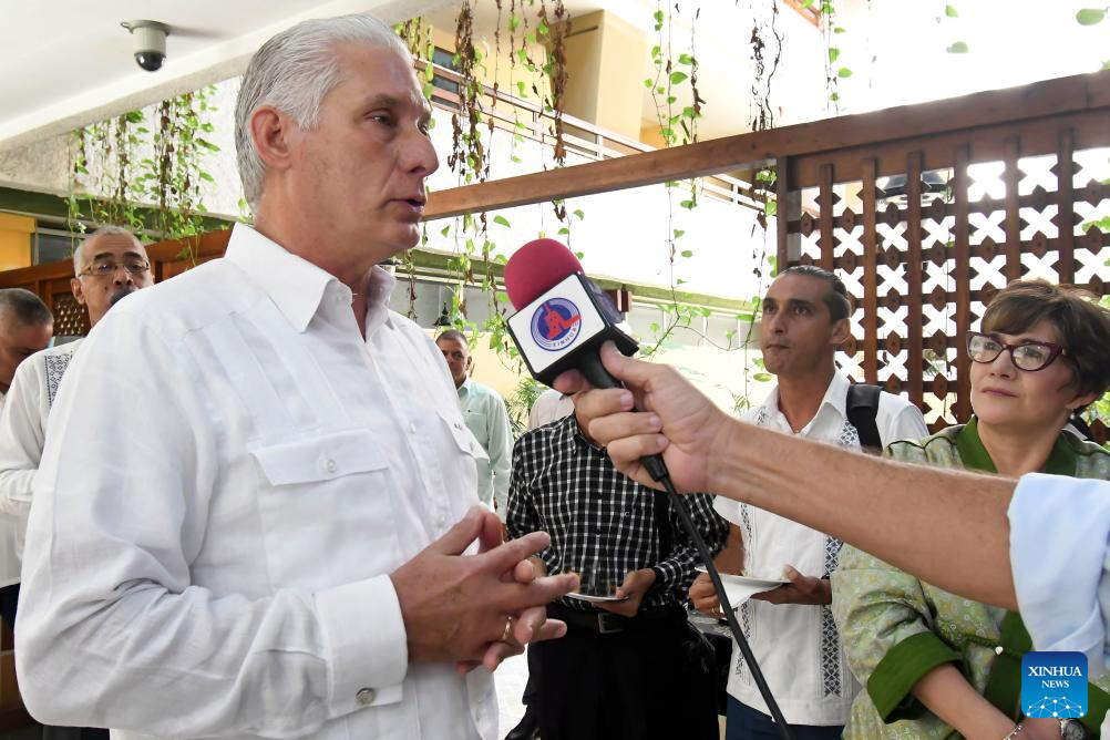 Imagen del 3 de octubre de 2025 del presidente cubano, Miguel Díaz-Canel (i), concediendo una entrevista a la Agencia de Noticias Xinhua durante su asistencia a la presentación de la tesis del artista chino, Huo Yaofei, en La Habana, capital de Cuba. El artista, Huo Yaofei, se convirtió el viernes en el primer ciudadano chino en alcanzar el grado de Doctor en Ciencias en una universidad de Cuba, al defender con éxito una investigación sobre el intercambio cultural entre ambas naciones. (Xinhua/Joaquín Hernández)