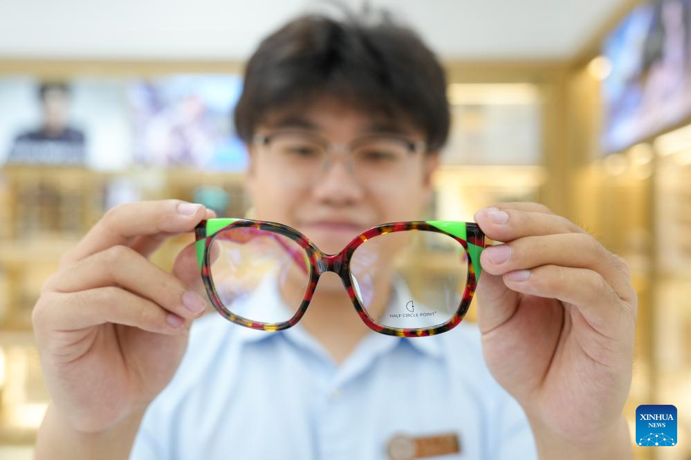 NANJING, 3 octubre, 2025 (Xinhua) -- Imagen del 25 de septiembre de 2025 de un trabajador mostrando un par de armazones de anteojos en el Centro Optico Internacional de Danyang, en Danyang, en la provincia de Jiangsu, en el este de China. Danyang ha sido bautizada como la "ciudad de los anteojos" de China, ya que cuenta con más de 1.600 empresas y más de 50.000 personas dedicadas a la industria de las gafas. (Xinhua/Li Bo)