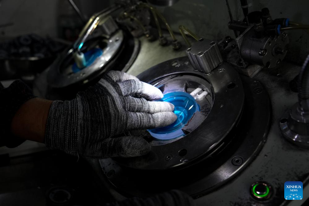 NANJING, 3 octubre, 2025 (Xinhua) -- Imagen del 25 de septiembre de 2025 de un trabajador procesando una pieza de lente en un taller de una empresa de anteojos ópticos, en Danyang, en la provincia de Jiangsu, en el este de China. Danyang ha sido bautizada como la "ciudad de los anteojos" de China, ya que cuenta con más de 1.600 empresas y más de 50.000 personas dedicadas a la industria de las gafas. (Xinhua/Li Bo)