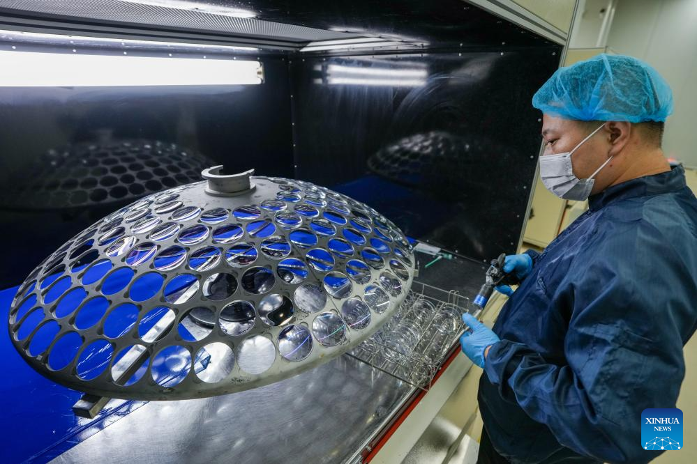 NANJING, 3 octubre, 2025 (Xinhua) -- Imagen del 27 de septiembre de 2025 de un trabajador cargando lentes digitales de forma libre para su recubrimiento en un taller de Jiangsu Hongxu Desheng Co., Ltd., en Danyang, en la provincia de Jiangsu, en el este de China. Danyang ha sido bautizada como la "ciudad de los anteojos" de China, ya que cuenta con más de 1.600 empresas y más de 50.000 personas dedicadas a la industria de las gafas. (Xinhua/Li Bo)