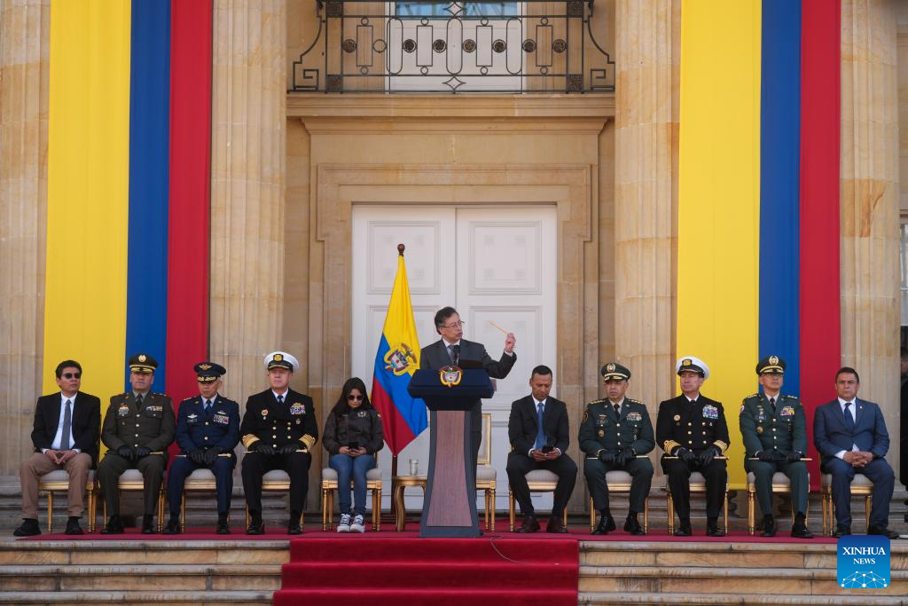 BOGOTA, 3 octubre, 2025 (Xinhua) -- Imagen proveída por la Presidencia de Colombia del presidente colombiano, Gustavo Petro, hablando durante una ceremonia de ascenso del nivel ejecutivo y el ingreso al grado de subintendentes de patrulleros de la Policía Nacional, en Bogotá, capital de Colombia, el 3 de octubre de 2025. Petro pidió el viernes al Gobierno de Estados Unidos no entrometerse en asuntos de política de su país, tras la crítica del representante estadounidense ante el Consejo de Seguridad de las Naciones Unidas, Michael Waltz, a su política de "Paz total". (Xinhua/Juan Diego Cano/Presidencia de Colombia)