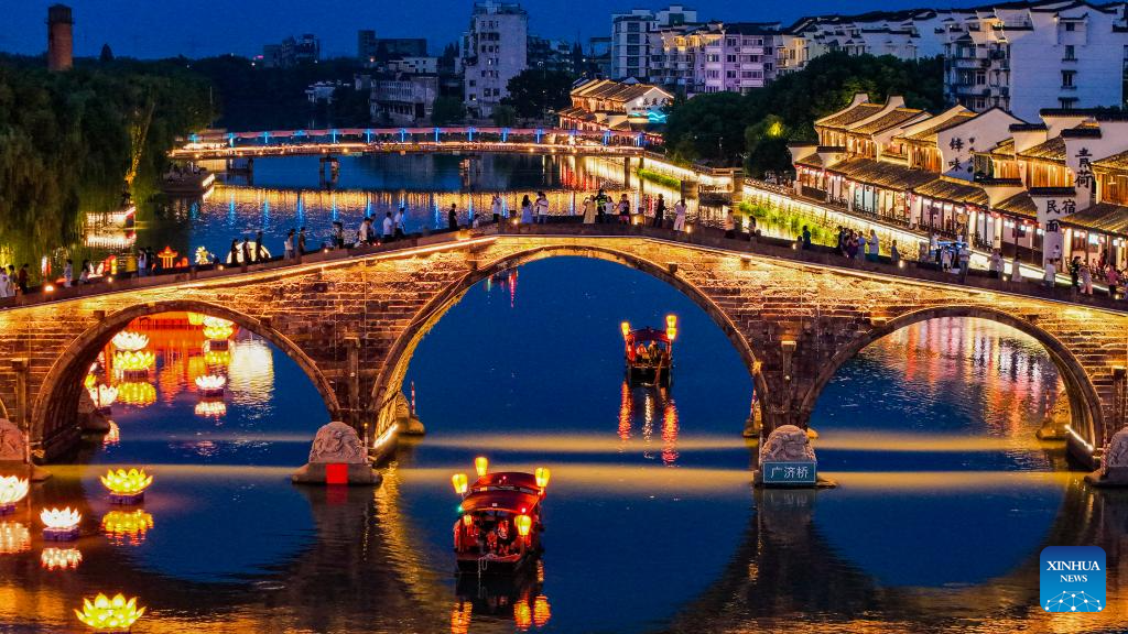 HANGZHOU, 3 octubre, 2025 (Xinhua) -- Imagen del 2 de octubre de 2025 de turistas tomando un paseo en bote para visitar el antiguo poblado de Tangqi, en Hangzhou, en la provincia de Zhejiang, en el este de China. El poblado ofrece a los turistas paseos nocturnos en bote y deslumbrantes linternas durante los ocho días de vacaciones por el Día Nacional y el Festival de Medio Otoño que comenzaron el miércoles. (Xinhua/Xu Yu)