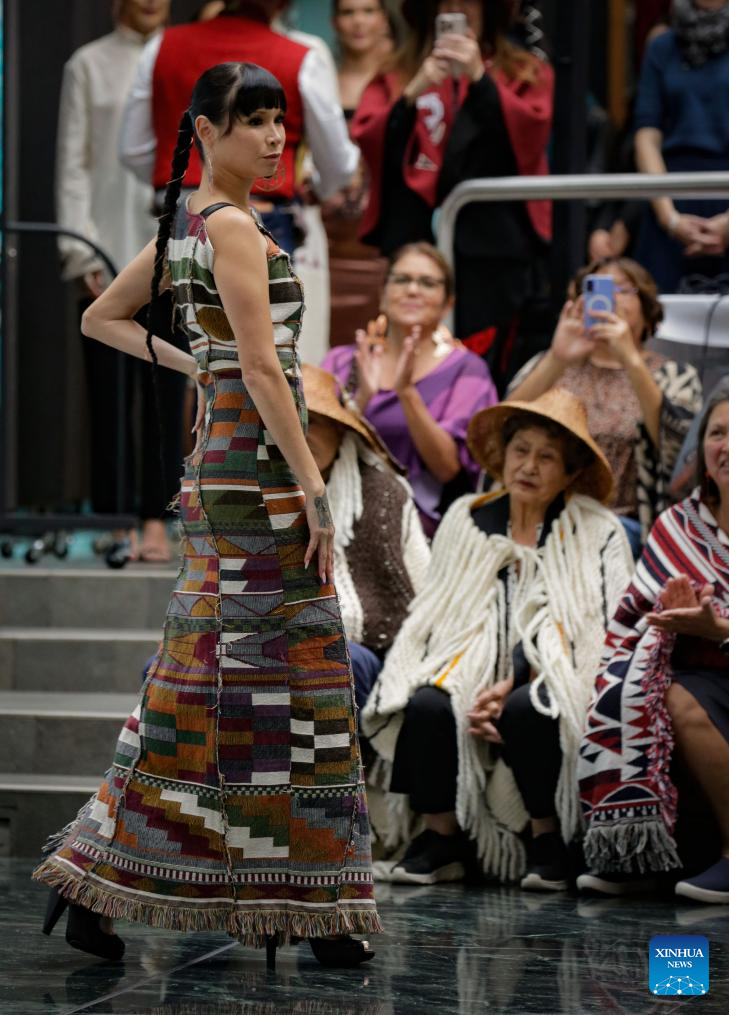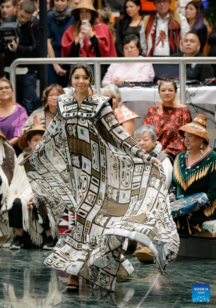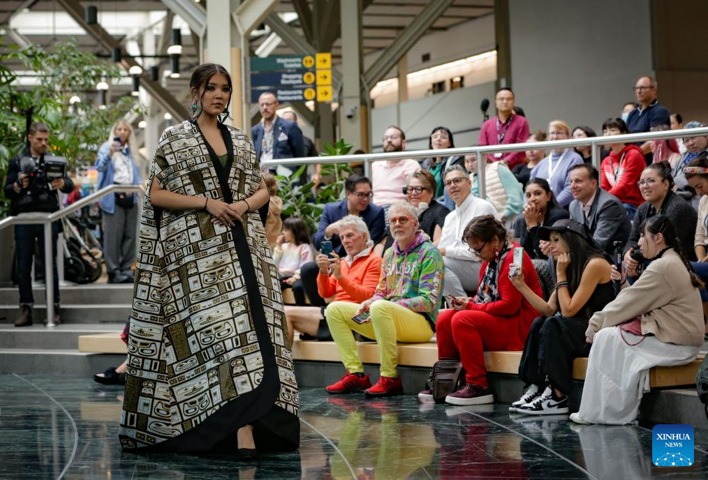 RICHMOND, 4 octubre, 2025 (Xinhua) -- Imagen del 3 de octubre de 2025 de una modelo presentando una creación de un diseñador indígena durante la vista previa del desfile de moda indígena llevada a cabo en la terminal del Aeropuerto Internacional de Vancouver, en Richmond, Columbia Británica, Canadá. El Aeropuerto Internacional de Vancouver llevó a cabo el viernes su primer desfile de moda indígena en colaboración con la Semana de la Moda Indígena de Vancouver (VIFW, por sus siglas en inglés), mostrando las últimas creaciones de diseñadores indígenas antes del evento principal de la VIFW que tendrá lugar en noviembre. (Xinhua/Liang Sen)