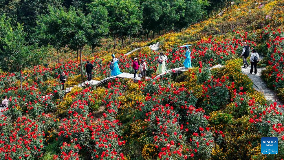 BEIJING, 4 octubre, 2025 (Xinhua) -- Imagen tomada con un dron el 4 de octubre de 2025 de turistas en un punto escénico, en el distrito de Xinglong de la ciudad de Chengde, en la provincia de Hebei, en el norte de China. Los destinos turísticos de toda China están experimentando un aumento en el número de visitantes desde el miércoles con el comienzo de las vacaciones de ocho días por el Día Nacional y el Festival de Medio Otoño. (Xinhua/Liu Mancang)