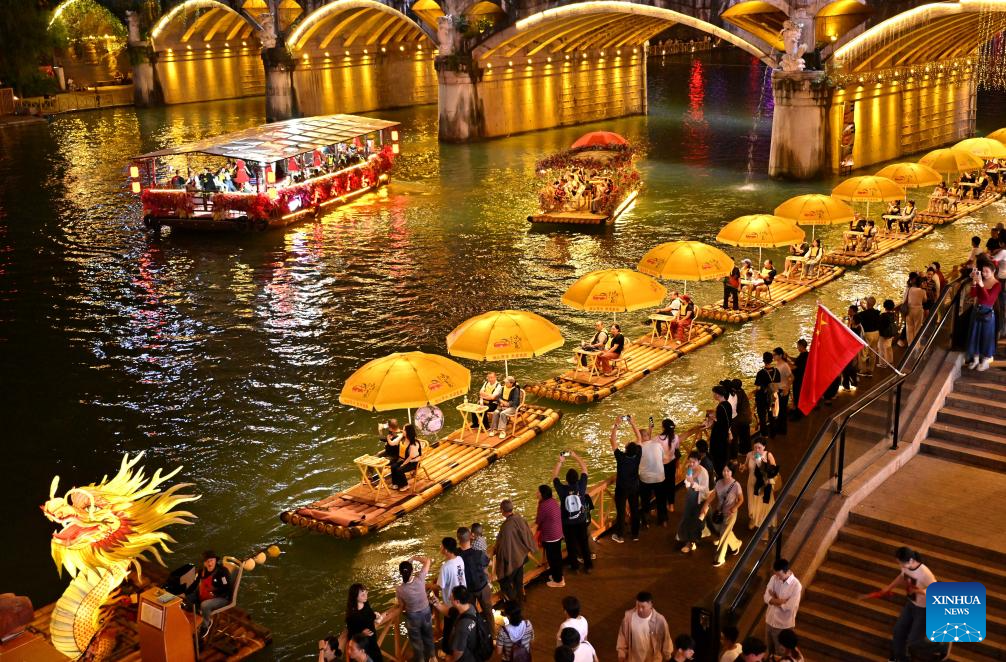 CHONGQING, 4 octubre, 2025 (Xinhua) -- Imagen del 3 de octubre de 2025 de turistas visitando el área escénica de Hongyadong, en la municipalidad de Chongqing, en el suroeste de China. (Xinhua/Guo Xu)