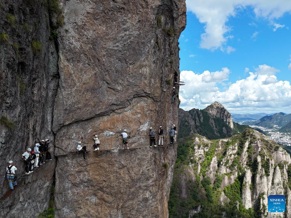 BEIJING, 4 octubre, 2025 (Xinhua) -- Imagen tomada con un dron el 4 de octubre de 2025 de turistas experimentando la Vía Ferrata, una forma de escalada asistida mediante cables de acero y puntos de apoyo anclados en las paredes de los acantilados, en un punto escénico en Yueqing de la provincia de Zhejiang, en el este de China. Los destinos turísticos de toda China están experimentando un aumento en el número de visitantes desde el miércoles con el comienzo de las vacaciones de ocho días por el Día Nacional y el Festival de Medio Otoño. (Xinhua/Cai Kuanyuan)